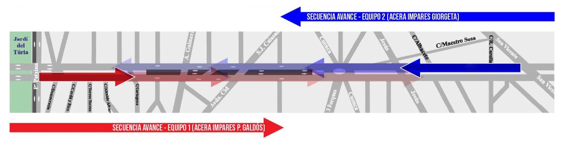 Las obras serán ejecutadas por dos equipos simultáneos trabajando en sentido de la marcha del tráfico desde ambos extremos de la avenida.