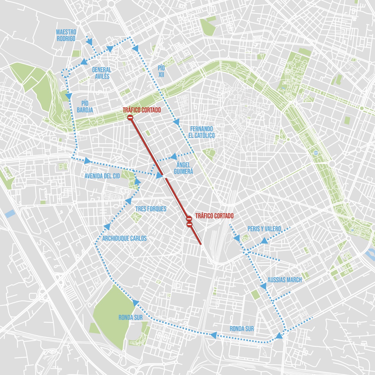 Actualment tancat el tram comprés entre els carrers Sant Vicent Màrtir i carrer Jesús, i el tram entre el Passeig de la Petxina i el carrer Linares.
